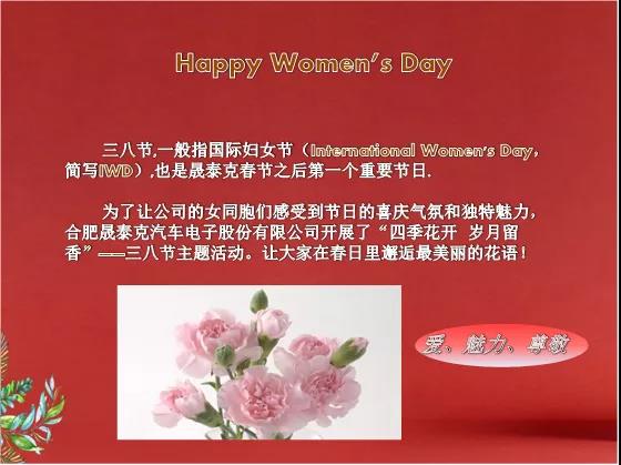 “三八”國(guó)際婦女節(jié)——是女性專屬的節(jié)日,是女性勞動(dòng)者用勤勞、智慧和善良等諸多優(yōu)良品德所贏得的社會(huì)尊重,也是全社會(huì)女性最歡欣鼓舞的一天。合肥晟泰克汽車(chē)電子股份有限公司每年這一天,都會(huì)為女員工們舉辦暖心的活動(dòng),送上一份鮮花,一份問(wèn)候。讓女同胞們收獲更多的溫馨與感動(dòng)。在此,祝晟泰克的小主們節(jié)日快樂(lè)!祝晟泰克的明天會(huì)更好!