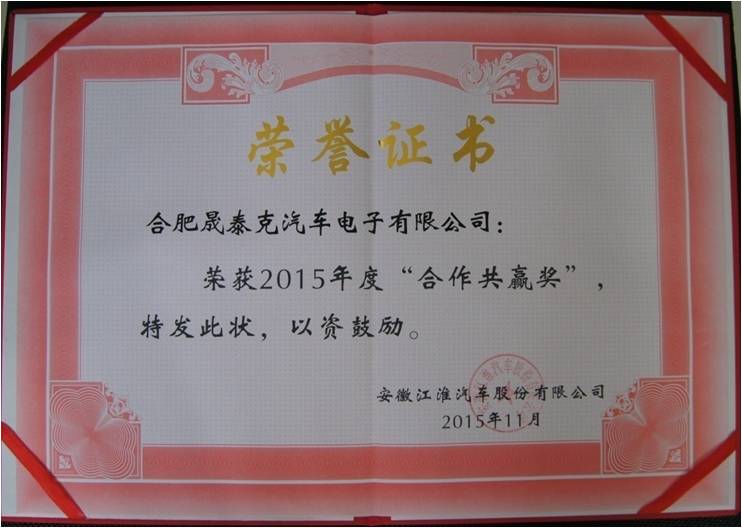 2015年獲得江淮合作共贏獎獎狀