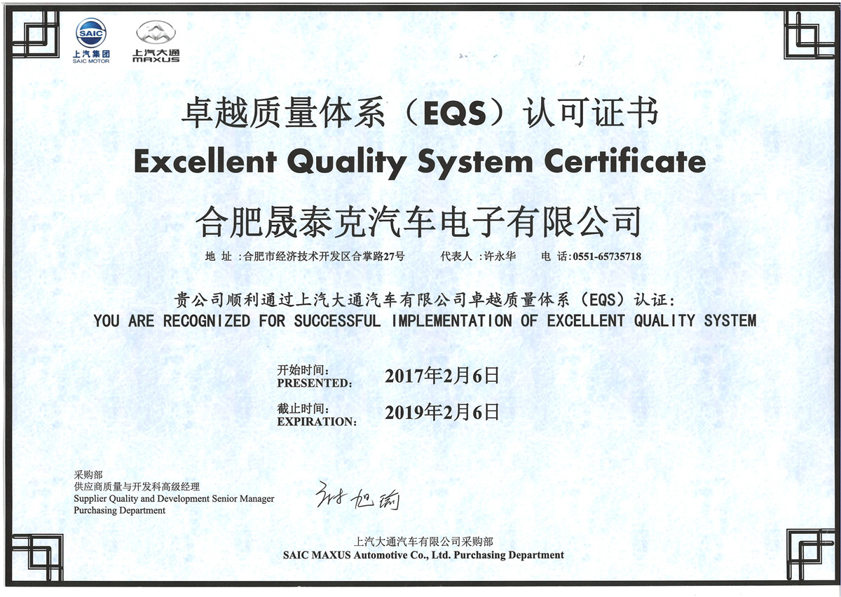 2017.2.6上汽大通汽車卓越質(zhì)量體系EQS認(rèn)可證書